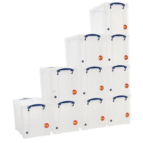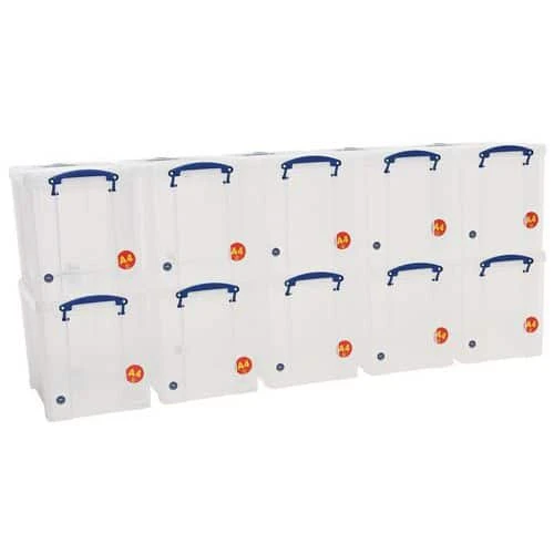 Pack of ten 19-litre clip-lock lid containers ideal for storing A4 files.
