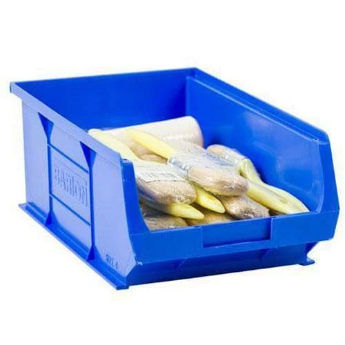 - One-piece injection moulded bin with reinforced sides and stacking rim.