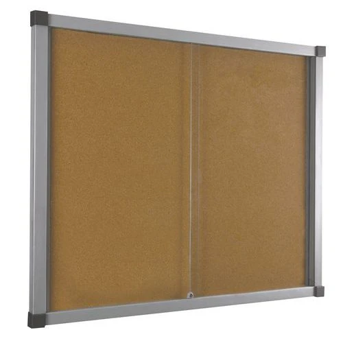 - Indoor enclosed bulletin board with aluminium frame and grey plastic corners.