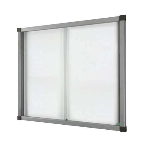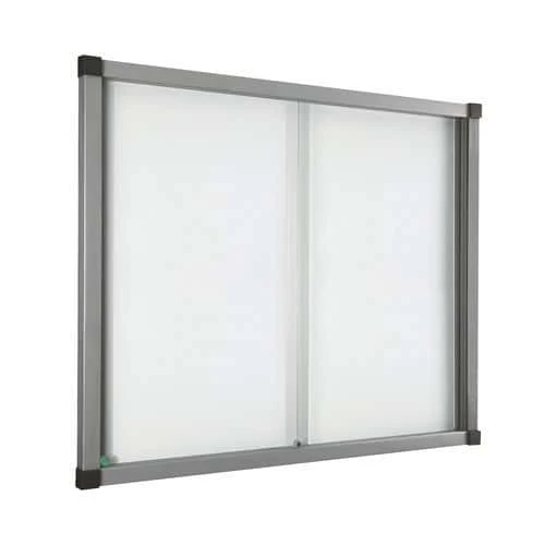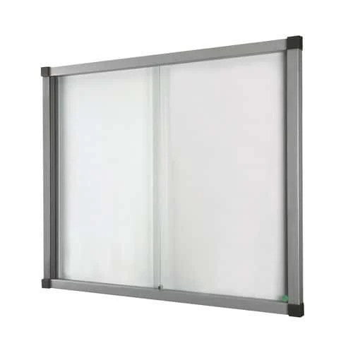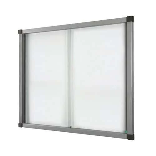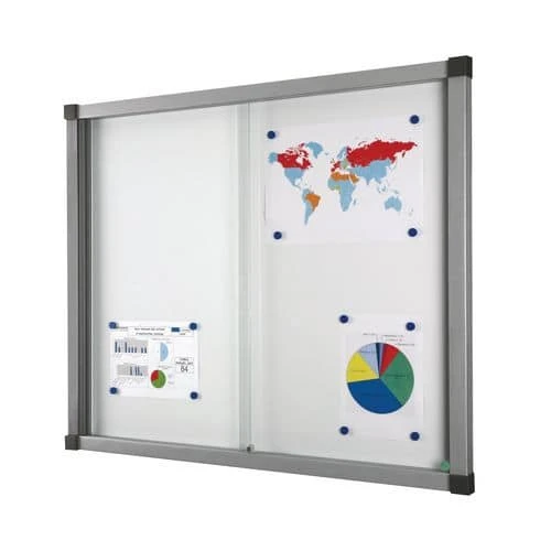 - Indoor enclosed bulletin board with aluminium frame and grey plastic corners.