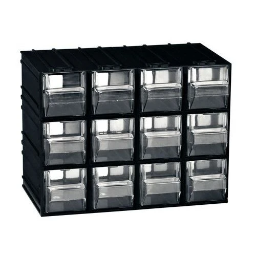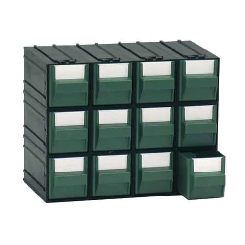 - Solid drawer unit with 12 green or transparent drawers with label holders.