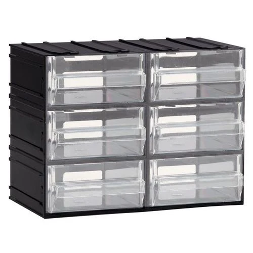 - Solid drawer unit with 6 green or transparent drawers with label holders.