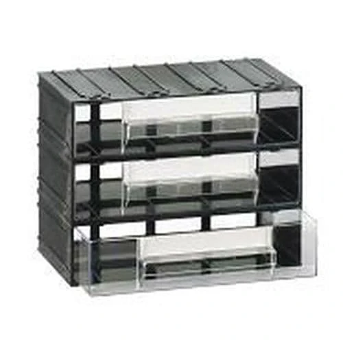 - Solid drawer unit with 3 green or transparent drawers with label holders.