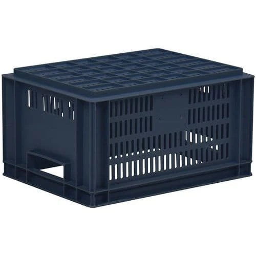 Ventilated food grade crates, suitable to use on pallets. Stackable and hard-wearing.