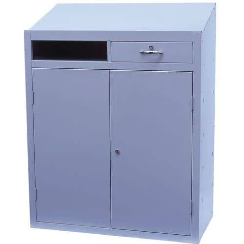 - The lectern-styled desktop slopes to allow a user to work comfortably while standing.