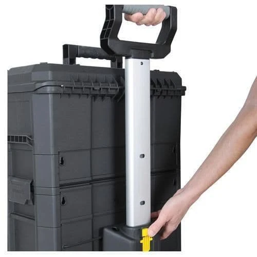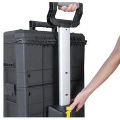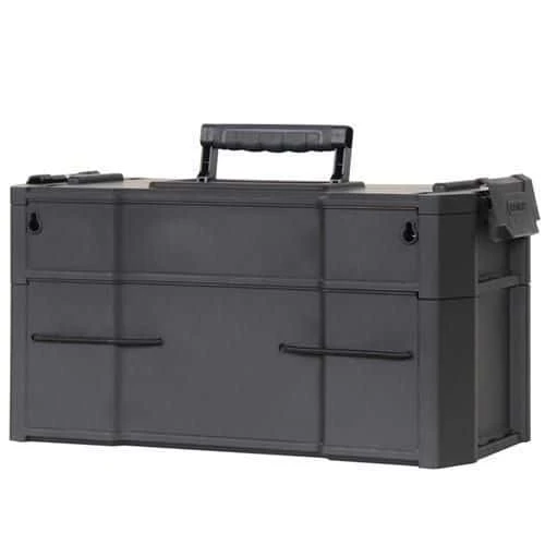 - Includes a tool box with one drawer, a 2 drawer storage unit including shallow and deep drawer and a bottom flip bin with a back pocket for long tools.